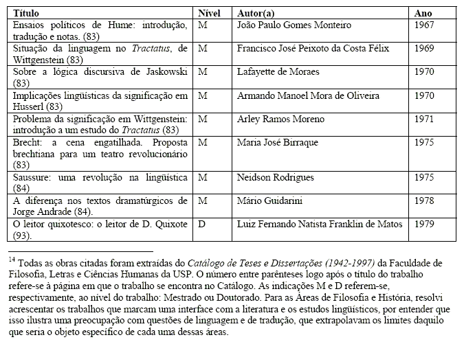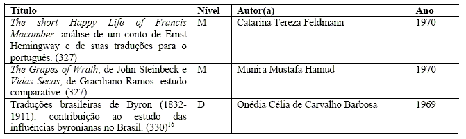 Os trabalhos arrolados a seguir – selecionados de forma inevitavelmente subjetiva – são apenas alguns exemplos da produção acadêmica direta ou indiretamente relacionada à tradução na FFLCH-USP, apresentada aqui por títulos de teses e dissertações defendidas entre meados dos anos de 1950 e 1979.